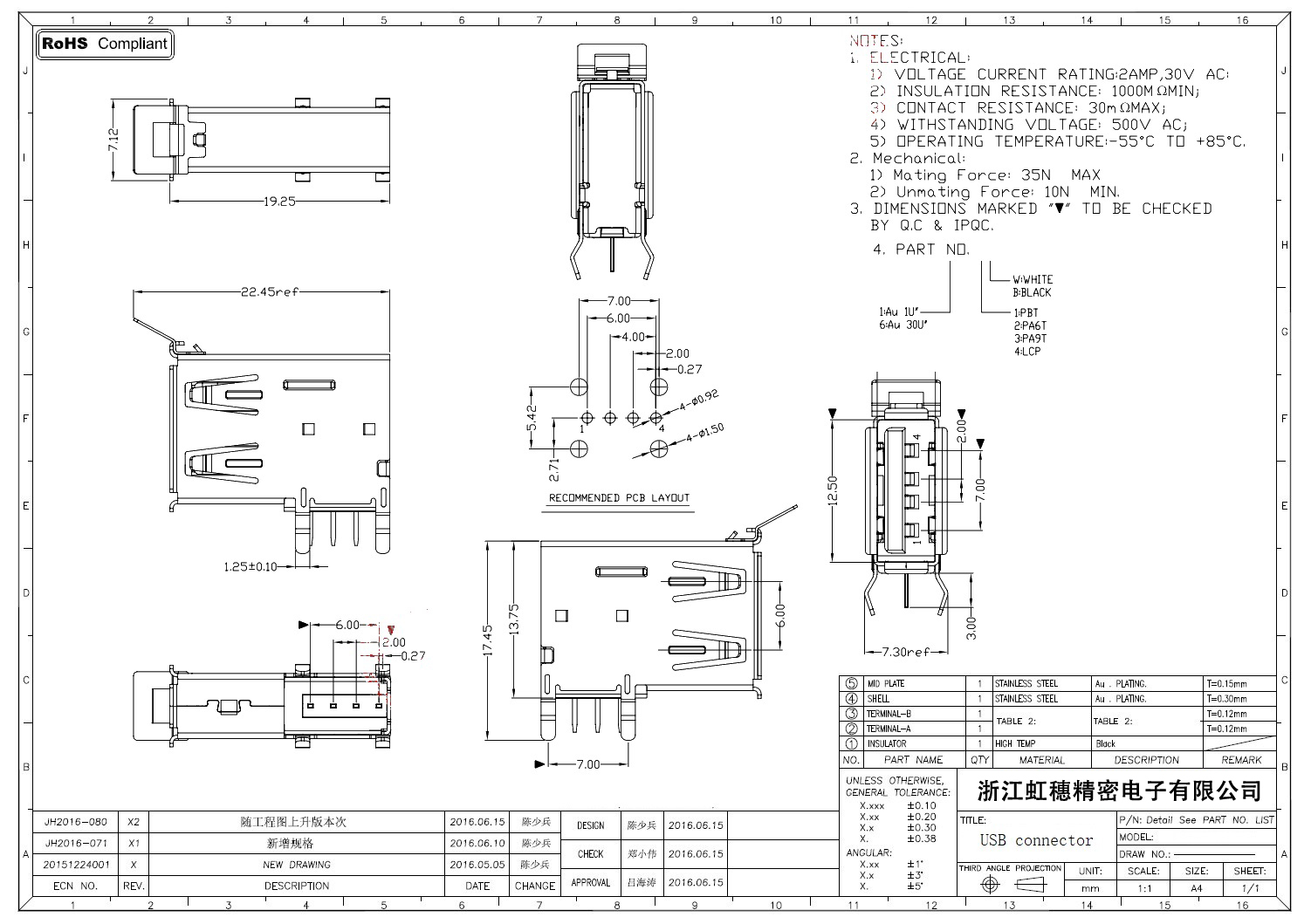 2.0USB插座技術參數: