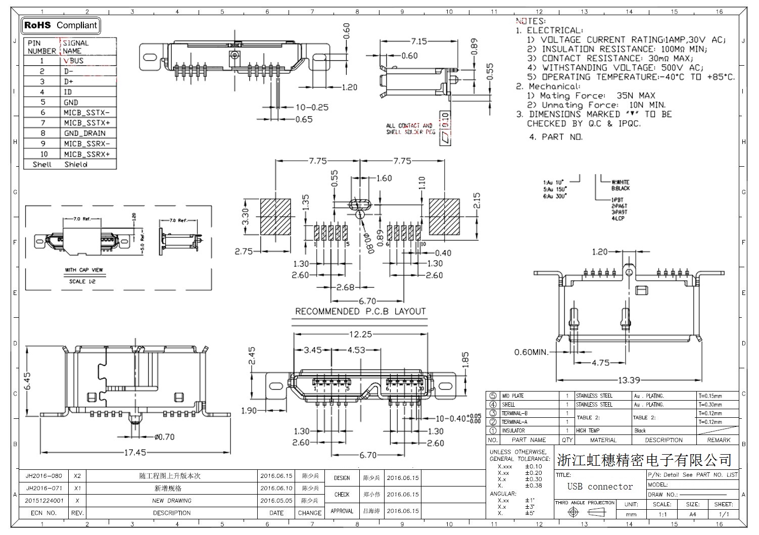 MICRO USB插座技術參數: