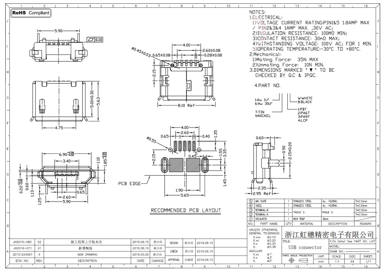 MICRO USB插座技術參數: