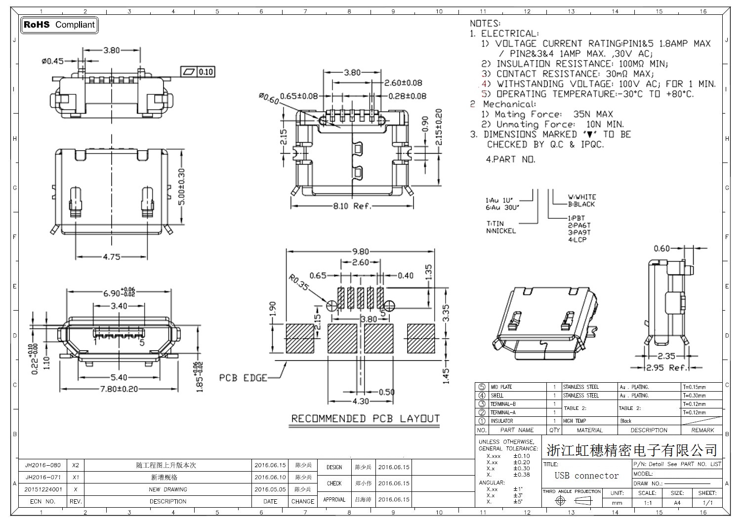 MICRO USB插座技術參數: