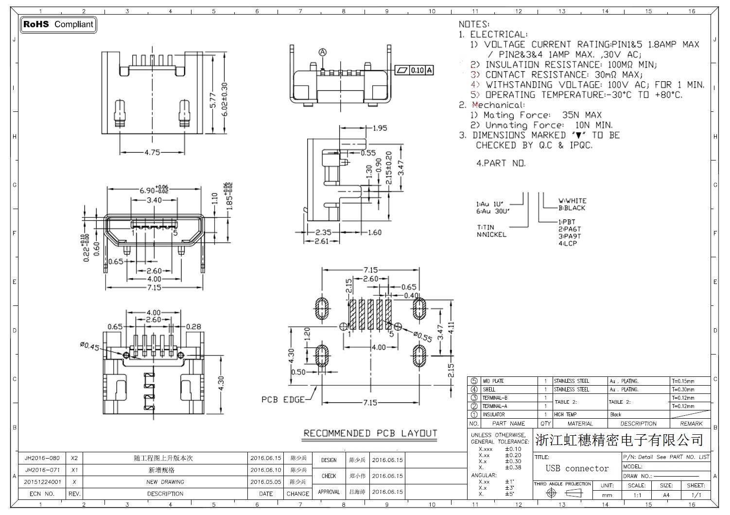 MICRO USB插座技術(shù)參數(shù):