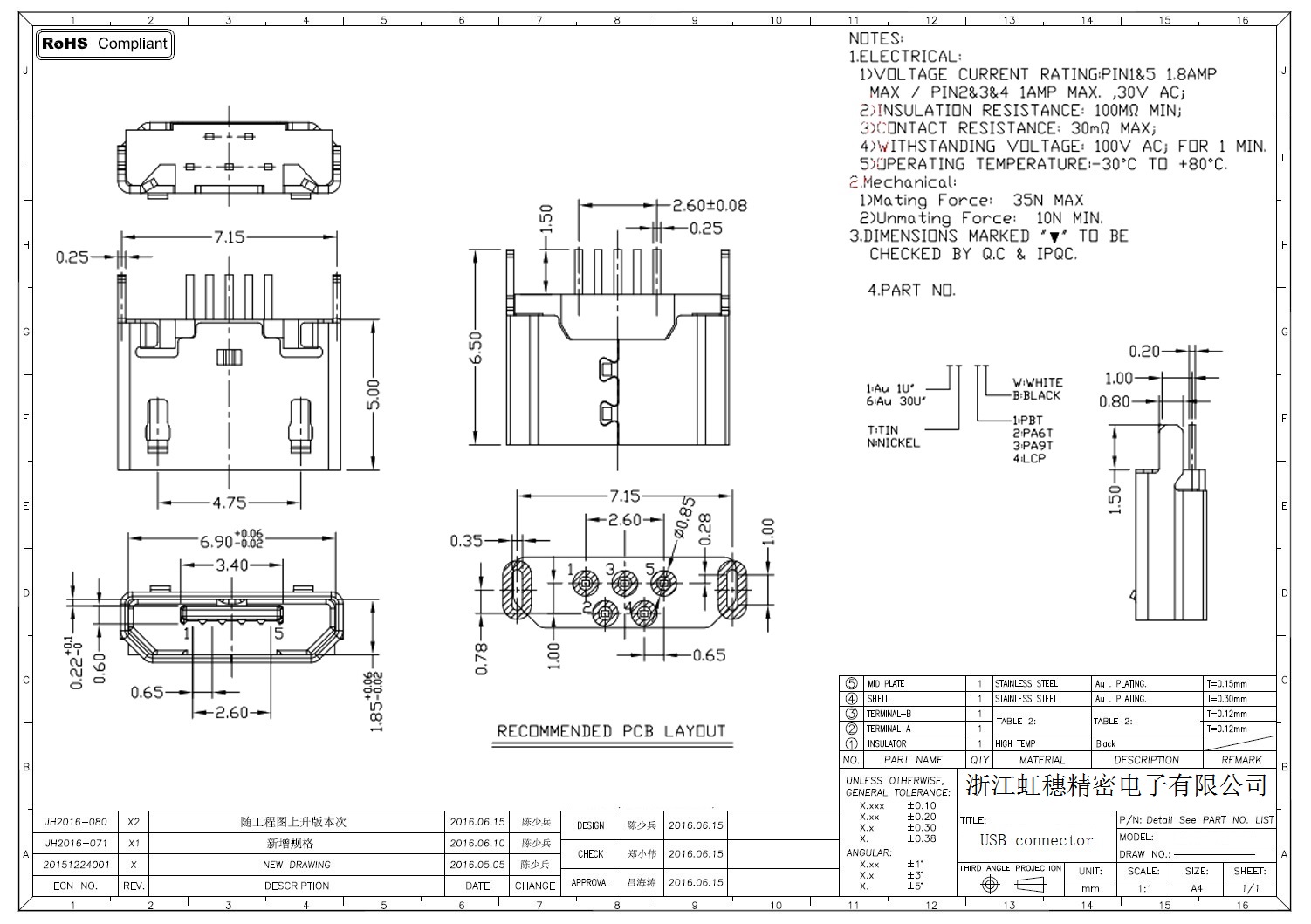 MICRO USB插座技術參數: