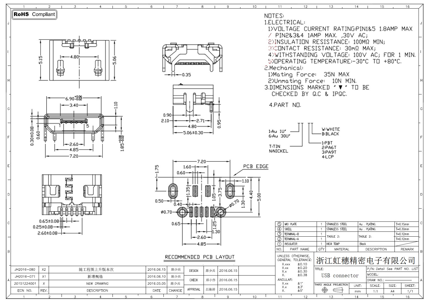 MICRO USB插座技術(shù)參數(shù):