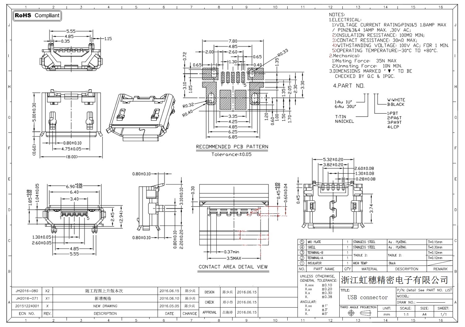 MICRO USB插座技術參數:
