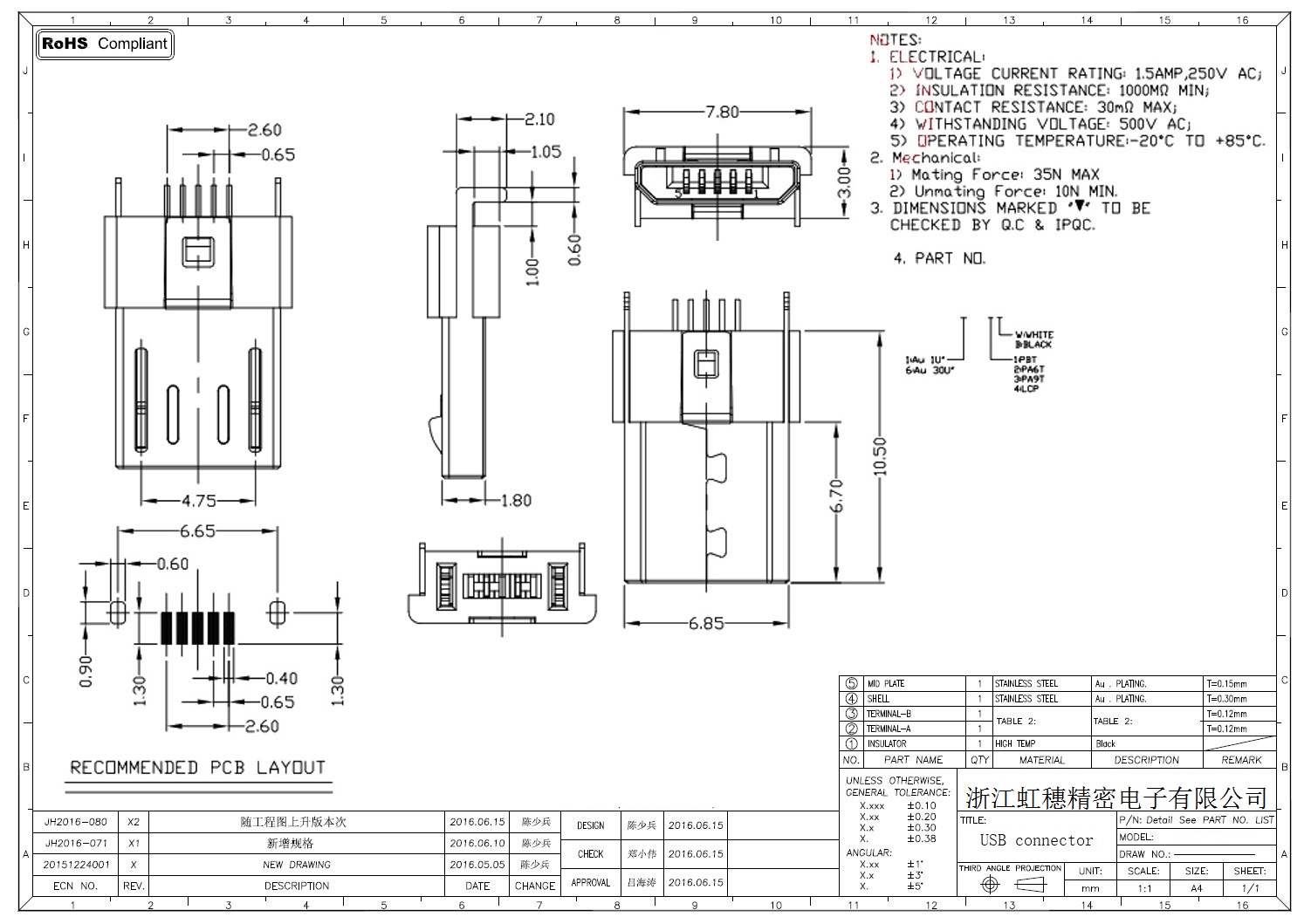 MICRO USB插座技術(shù)參數(shù):