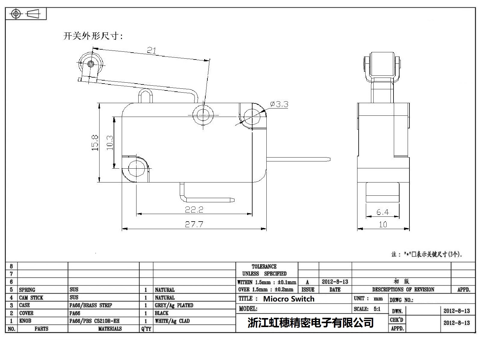 .請(qǐng)根據(jù)額定值電流、操作負(fù)載、驅(qū)動(dòng)桿的種類(lèi)、使用溫度等要求選擇合適型號(hào)的開(kāi)關(guān);