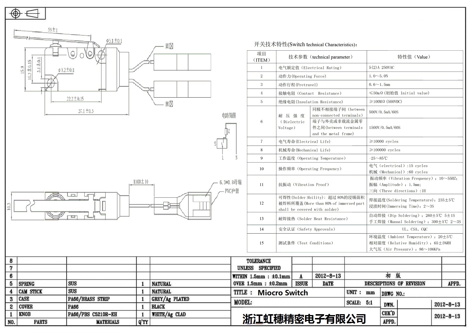 .請根據額定值電流、操作負載、驅動桿的種類、使用溫度等要求選擇合適型號的開關;