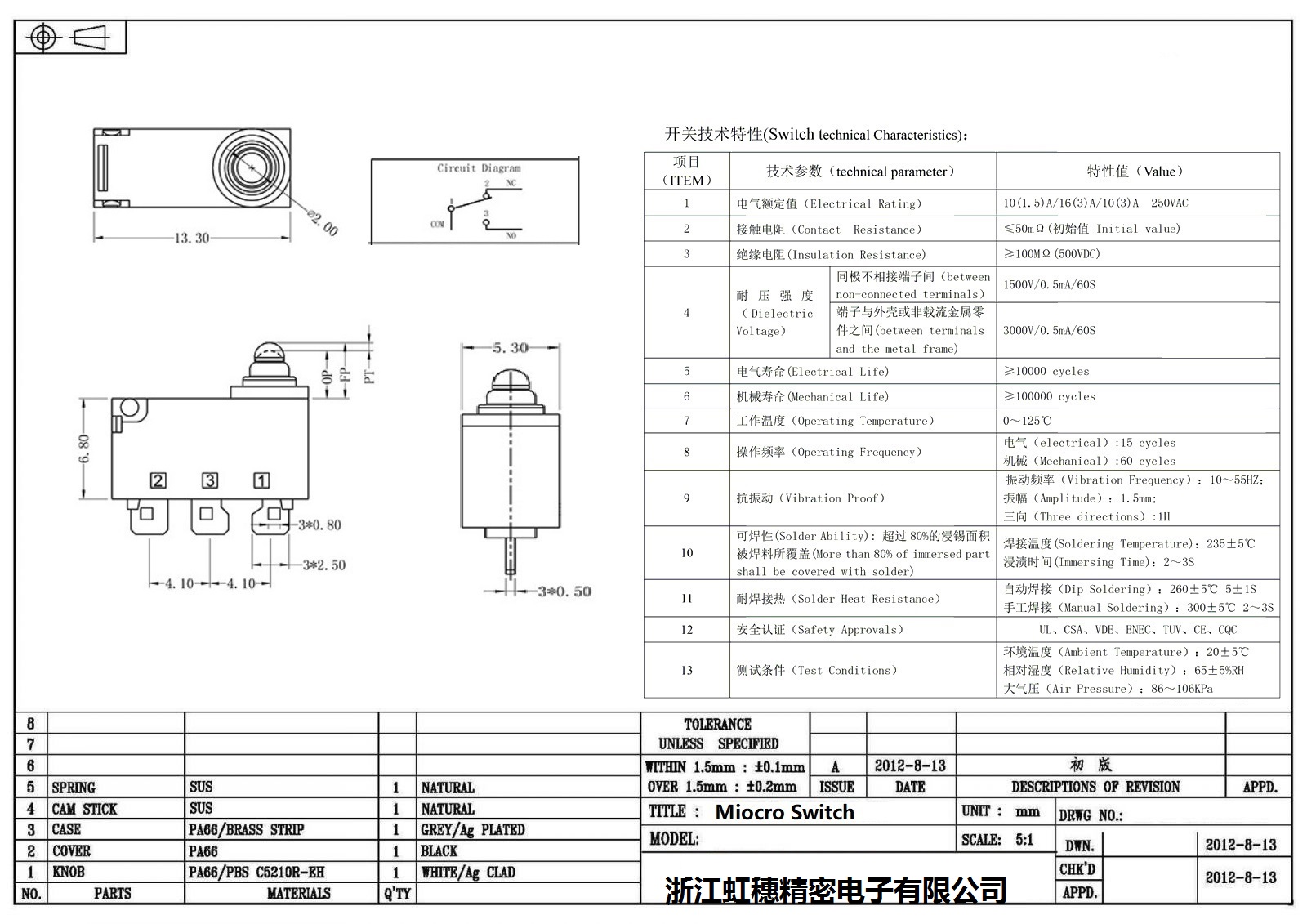 .請根據額定值電流、操作負載、驅動桿的種類、使用溫度等要求選擇合適型號的開關;