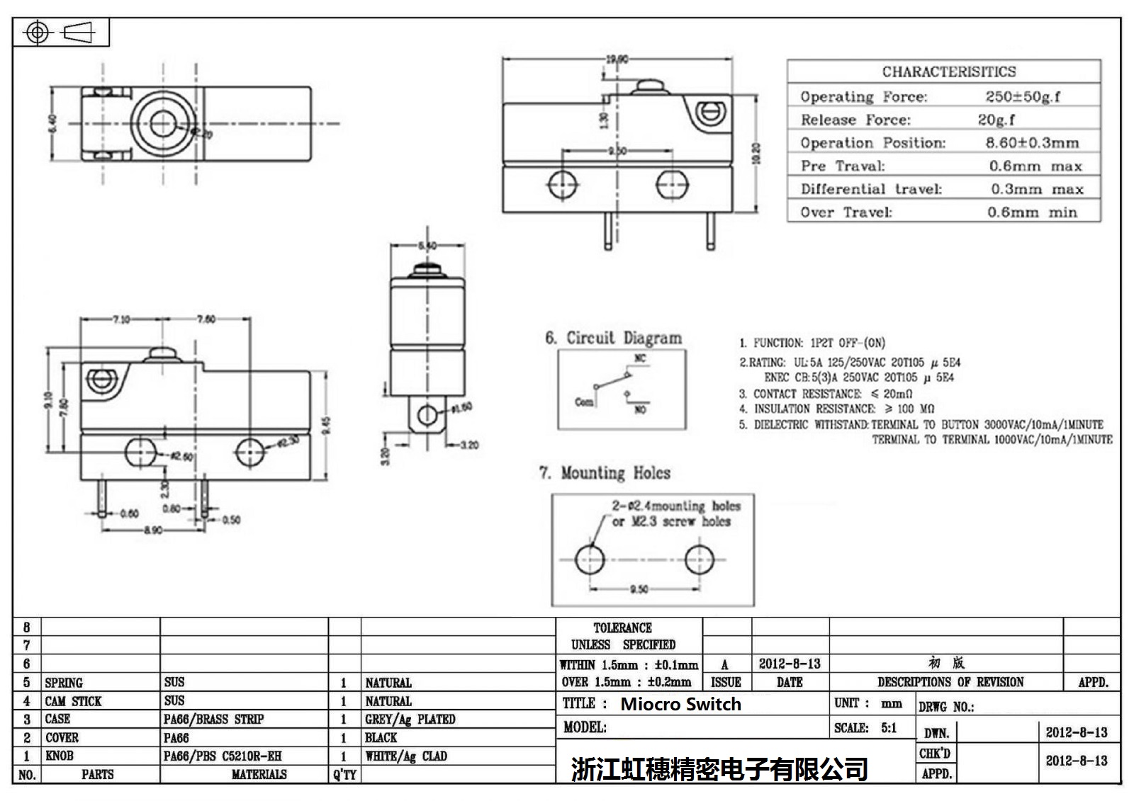 2.額定值:UL:5A125/250VAC 20T105 u 5E4