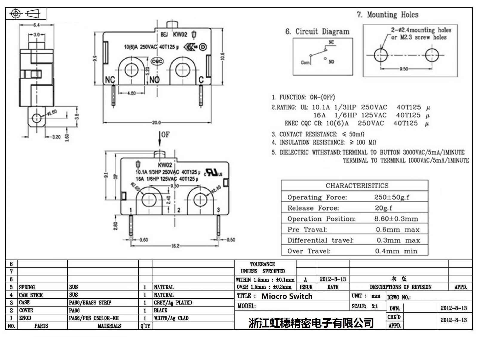 2.額定值:UL:5A125/250VAC 20T105 u 5E4