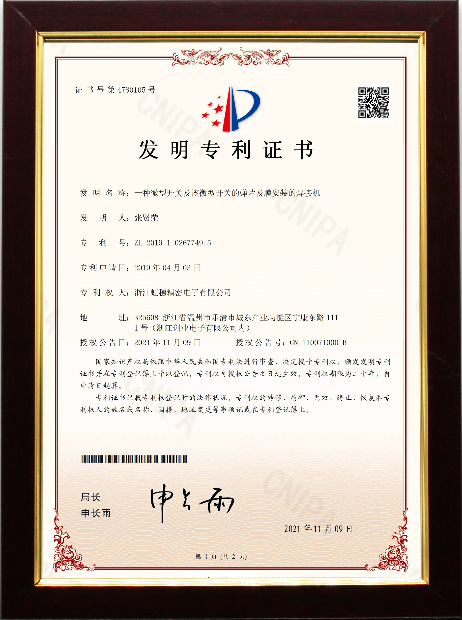 發明專利證書ZL201910267749.5
